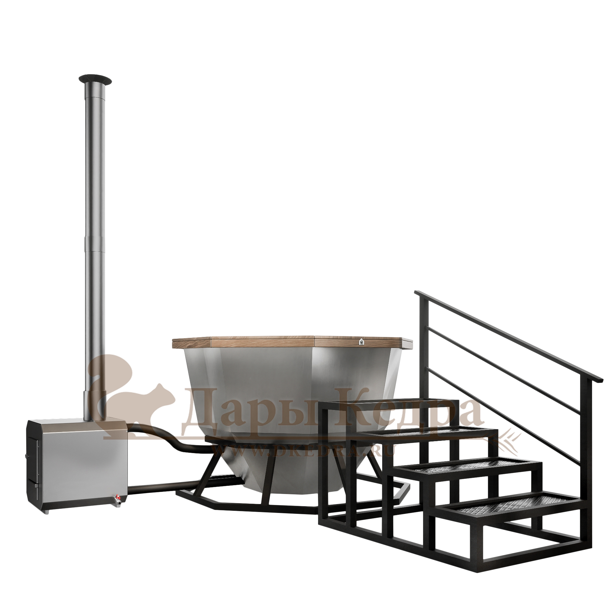 Банный чан из нержавеющей стали Ø-2350 на подставке с приставной печью Банный чан с приставной печкой изготовлен из пищевой стали. Представляет собой большую ёмкость в виде чаши, при нагревании которой можно париться на свежем воздухе. Чан установлен на устойчивую металлическую подставку и оснащен приставной печью с дымоходом. Банный чан оборудован кедровым бортом, скамейками, подспинниками, трапом для ног и приставной лестницей.