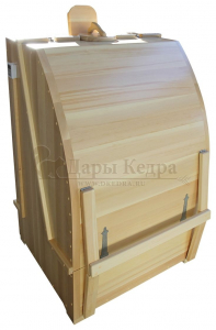 Квадратная фитобочка из кедра - это мини парная, которую можно использовать не только в спа-салонах, но и дома. Толщина стенок составляет 40-45 мм, что позволяет увеличить срок службы изделия. Откидная дверь бочки во время открывания фиксируется внешней подставкой - опорой, которая в закрытом состоянии складывается и не занимает лишнее пространство. Во время парения человек сидит внутри кедровой бочки, а голова находится снаружи. Благодаря этому исключается возможность перегрева. Встроенная ручка из кедра на двери делает эксплуатацию фитобочки более удобной.