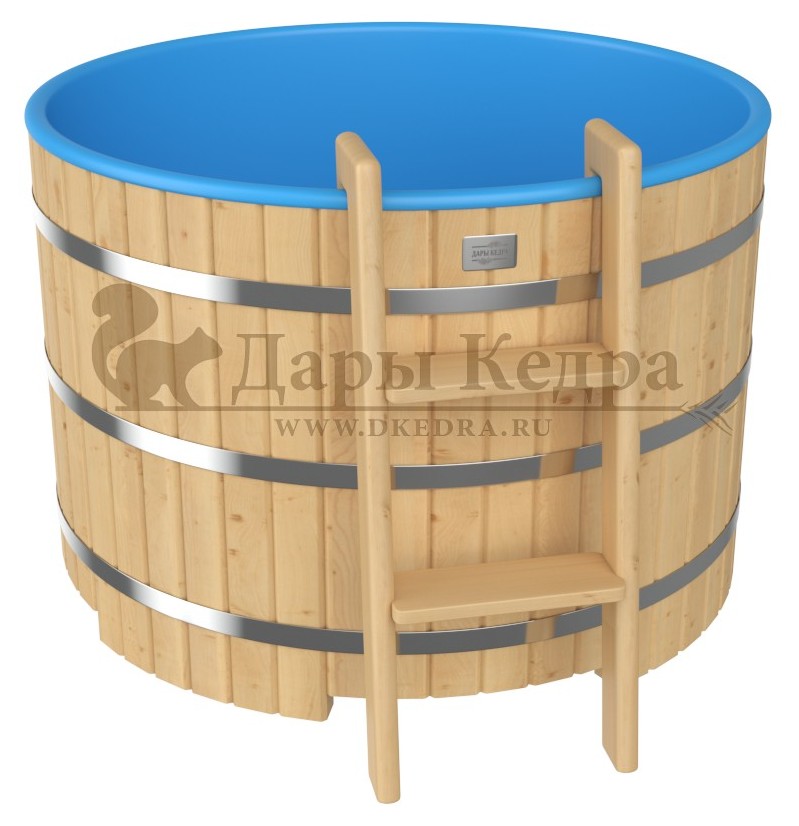 Бондарная круглая купель из кедра с пластиковой вставкой Особенность этой модели заключается в сборке купели по технологии лунный-паз. Паз (углубление) одной доски прочно соединяется с выемкой следующей. Такая сборка осуществляется без клея и гвоздей. Готовая конструкция прочно фиксируется нержавеющими обручами. Пластиковая вставка придает изделию красивый внешний вид, увеличивает срок службы и облегчает уход за купелью. Для удобства пользования купель оснащена лавочками, приставной и внутренней лестницей из кедра. Подходит для комнатного и уличного использования. Купели с пластиковой вставкой рекомендуется заказывать для непрерывного использования в банных комплексах или оздоровительных центрах. Внутренняя чаша облегчает уход за изделием и увеличивает срок службы купели.