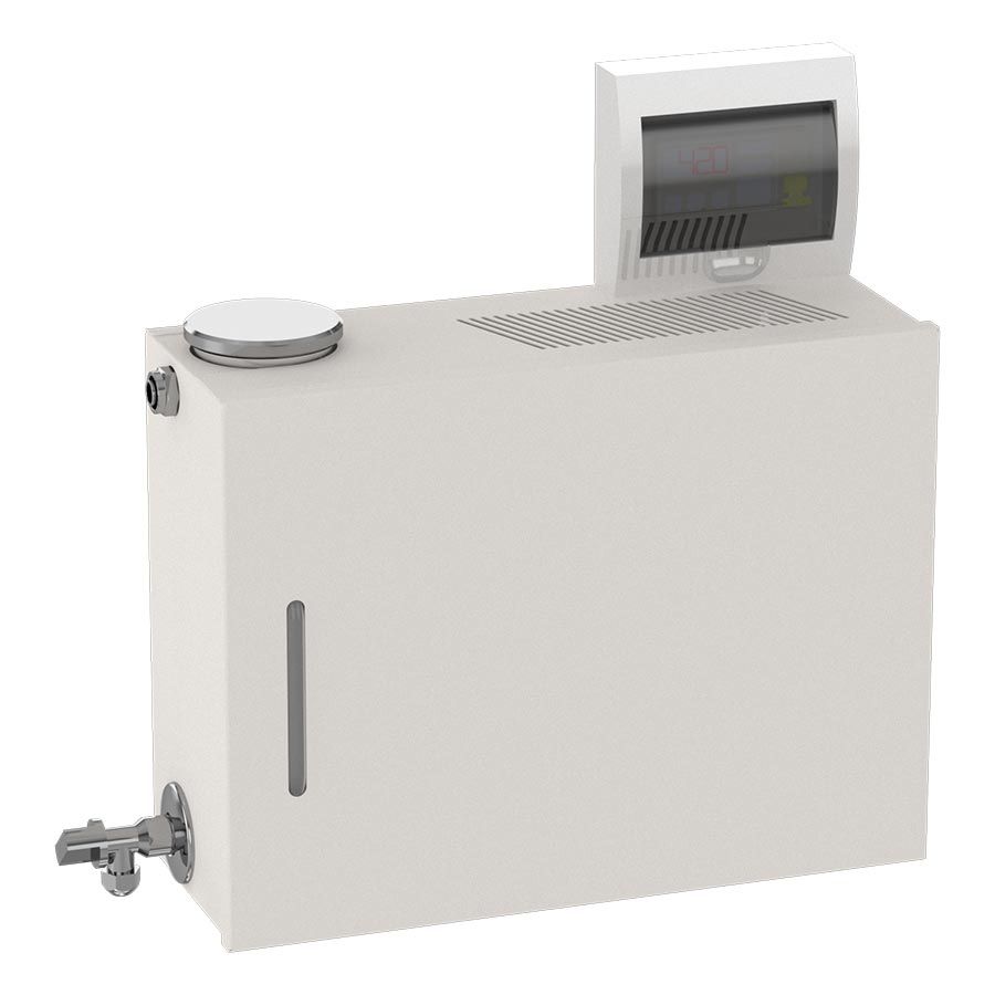 Парогенератор проточный, 2 кВт с выносным цифровым пультом управления Устройство служит для образования пара путем закипания воды. В металлическом корпусе парогенератора находится бак для воды со съемной аромаемкостью в виде сеточки. Рядом располагается индикатор в виде трубки, благодаря которому осуществляется визуальный контроль за уровнем воды. Проточные парогенераторы подключаются к водопроводу и автоматически добавляют воду в прибор при ее расходовании. Для удобства пользования парогенератор имеет выносной пульт управления, который позволяет установить температуру, мощность и время процедур парения. При достижении необходимой температуры, происходит автоматическое прекращение подачи тепла для нагрева воды. При снижении температуры более чем на 3°С, температурный датчик снова включает подогрев. Таким образом время непрерывной работы парогенератора составляет более 12 часов.