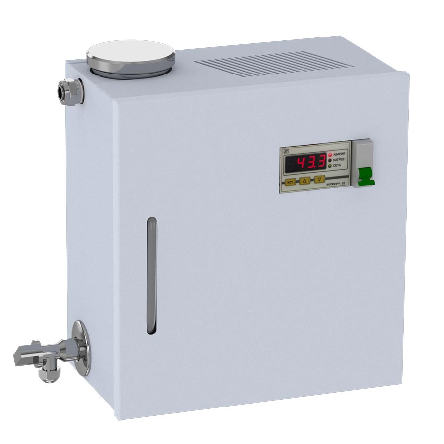 Парогенератор накопительный «EURO», 3 кВт Прибор служит для создания пара путем закипания воды. В металлическом корпусе парогенератора находится бак для воды со съемной аромаемкостью в виде сеточки. Рядом располагается индикатор в виде трубки, благодаря которому осуществляется визуальный контроль за уровнем воды. Парогенератор накопительного типа работает от электричества и не требует подключения к водопроводу. Вода в него добавляется самостоятельно. Управление парогенератором осуществляется за счет встроенного пульта, с помощью которого устанавливается температура, мощность и время процедур парения. Отличительной особенностью данной модели служит регулируемая мощность нагревательных элементов. Благодаря этому экономится электроэнергия и поддерживается оптимальная температура в фитобочке. При низком уровне воды устройство отключается автоматически.
