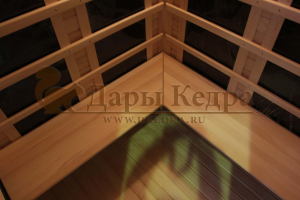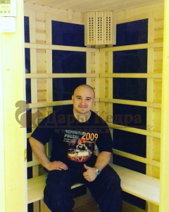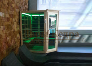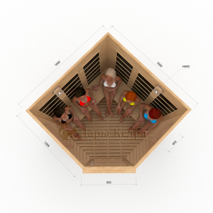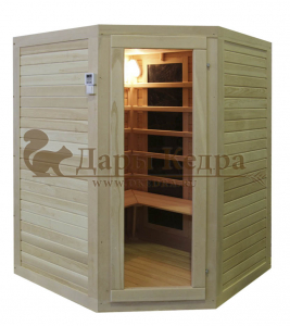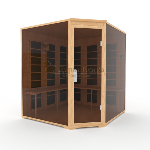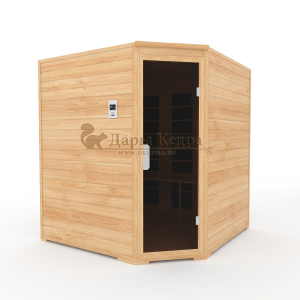Это специально оборудованная кедровая кабина для прогрева тела человека сухим теплом. Воздух в таких парных не нагревается. Инфракрасные лучи воздействуют на тело, равномерно прогревая мышцы, суставы и органы. Карбоновые излучатели, встроенные в стены кабины, обладают мягким прогревом, что полностью исключает возможность ожога. Работает кабина за счет электричества. Установка сауны в угол, позволяет рационально использовать пространство помещения. Эта вместительная модель подходит для коммерции.