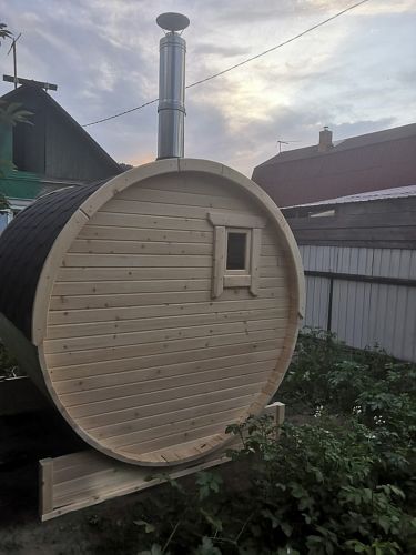 Много читал про такие бани-бочки, долго анализировал, в итоге пришел к мнению, что трехметровая баня-бочка-это оптимальное соотношение цены и качества, пространства. Кстати, в ней вполне хватает места даже для одновременного нахождения 3-4 человек, комфортнее, конечно, вдвоем)). Смотрится на участке красиво! Несколько раз протестировали баньку, остались очень довольными, а впереди целое лето...будем париться почти каждый день))